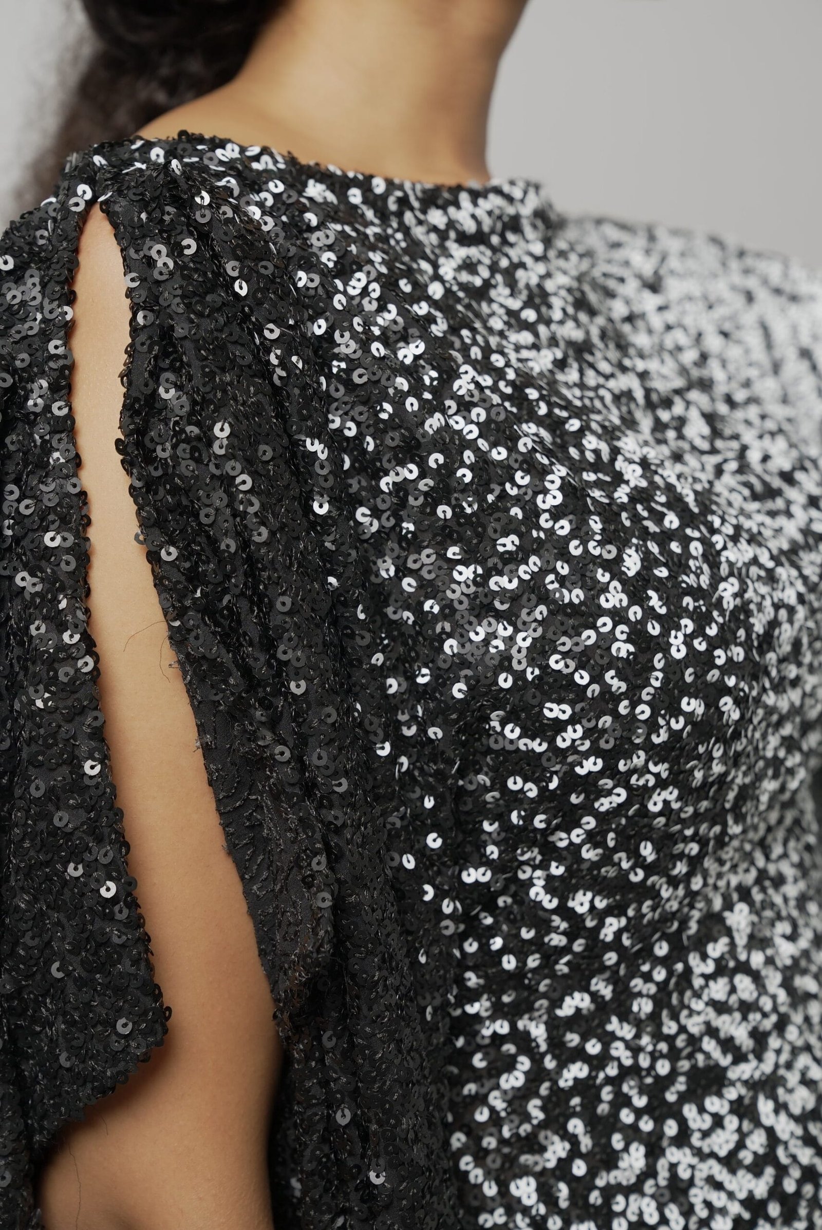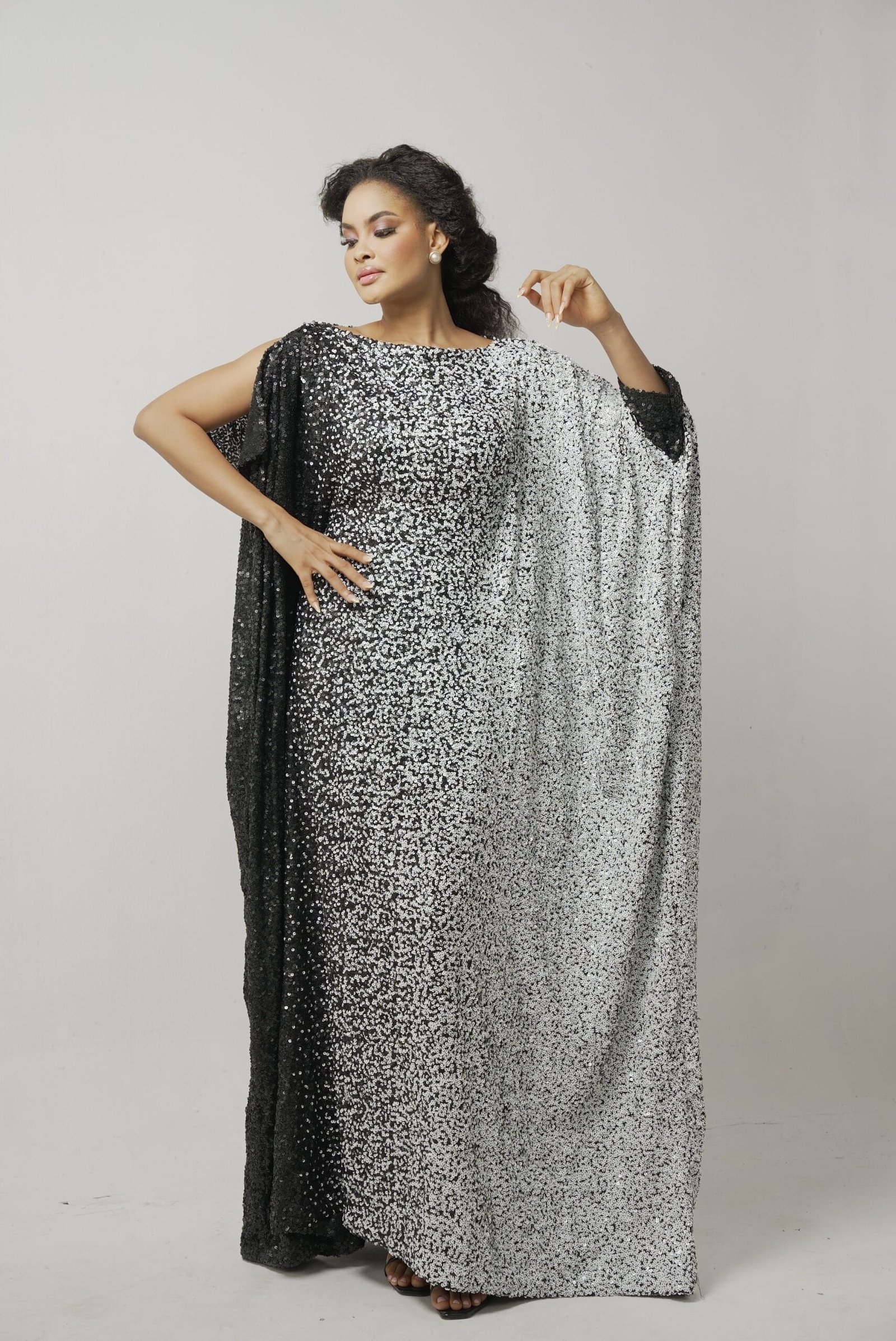 The Kira Kaftan combines elegance with a striking asymmetrical design. Its black and white sequined fabric catches the light beautifully, while the long sleeve contrasts with the sleeveless side, creating a chic silhouette.