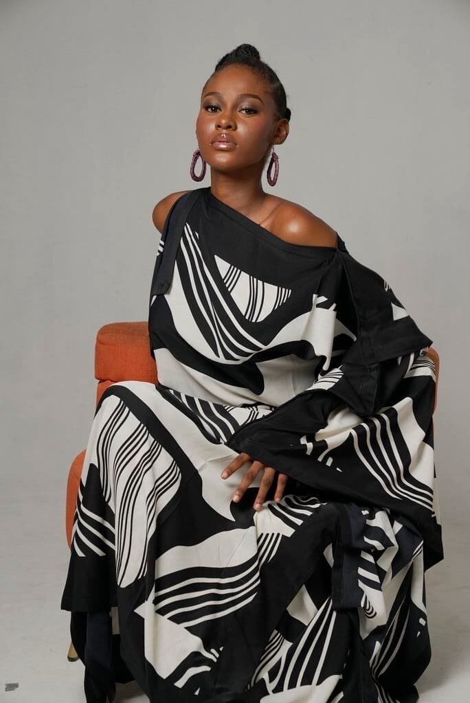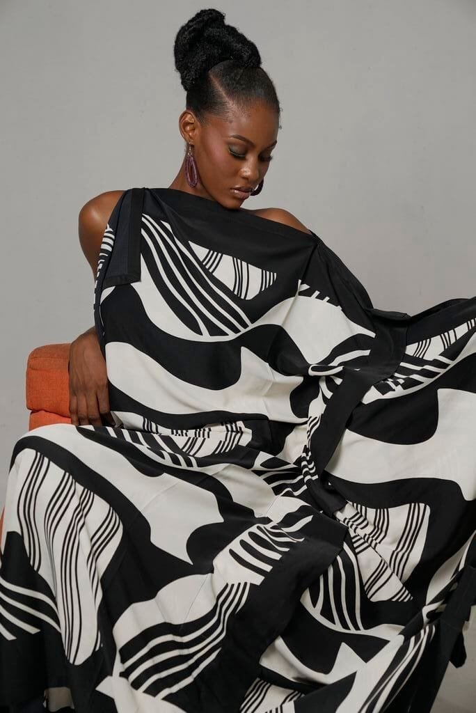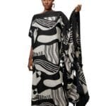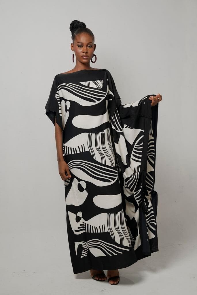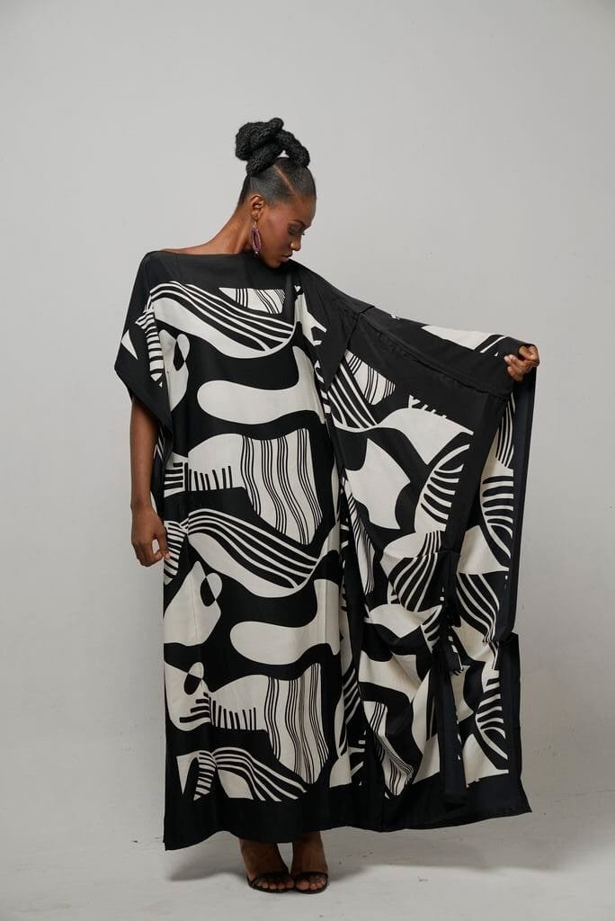The Picasso Kaftan features a dynamic design made from black and white crepe with fun irregular black patterns on a crisp white backdrop. This Kaftan brings an artistic flair to your wardrobe. It offers versatility for any occasion.